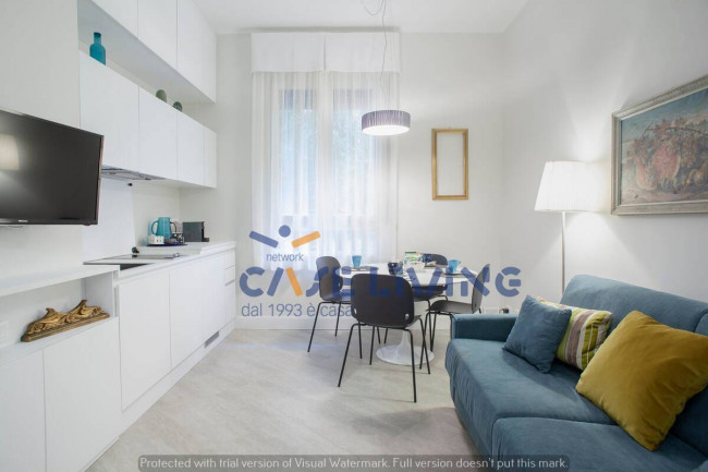 L'ingresso si apre su un soggiorno con cucina a vista, arredato con gusto e su misura, camera da letto matrimoniale e bagno dotato di box doccia e sanitari di design. L'intero Appartamento è caratterizzato da finiture di alta qualità e da un'atmosfera accogliente e confortevole, arredato e corredato.